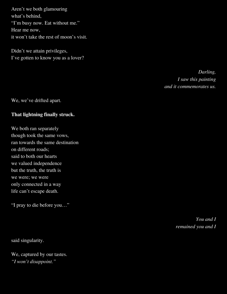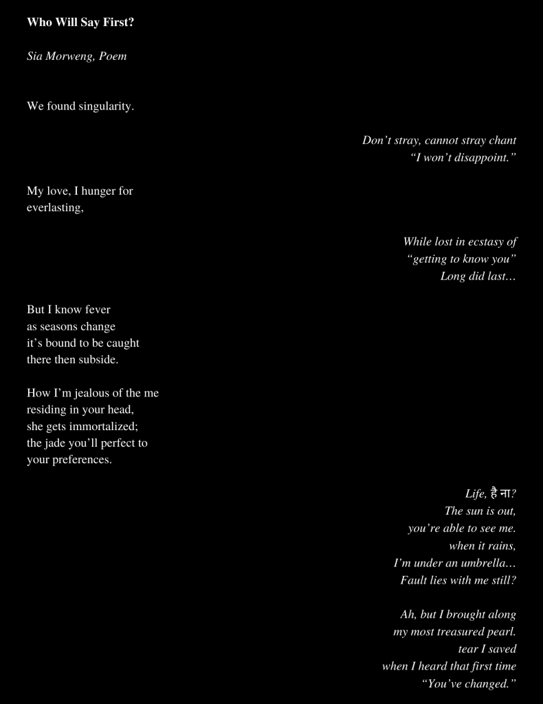 Before A Lifetime Sia Morweng, Poem What would a forgotten you be like, not left to your devices or scratched off my embroidered moments; simply my thoughts placing a curtain before my adamant desire to chase fantasy? Would I live up there with a forgetful wall, mirroring an empty space or would there be a shadow I cannot trace? What would my filled words sound like uninspired by teenage dreams? Could I still call a blue sky serene or pretend I know how to call the sun hope? Walking possessed by the mood of an untroubled day becomes My own mood, so the moon’s infinitude could accompany me into fruitful sleep, could my words still identify with those emotions? Are you significant to my painting of life I call my own in breaths? I wonder how I’ll call my star a jewel if it’s not a reflection of a look I captured in my galaxy “his eyes on me” as rare glimpse when I caught you catching my dreams? What would an unnamed you tell my dreams, as a stranger, could your voice reach synchronicity with the leap of my heart? how my heartbeat would duet with your voice when my thoughts were occupied christening my mind with changing season? This mystery… What would a you I’ve never met say to my swan like face, I dreamt a figure I drew and I’d like my eyes to convey to my thoughts and those To request my soul a mating dance?